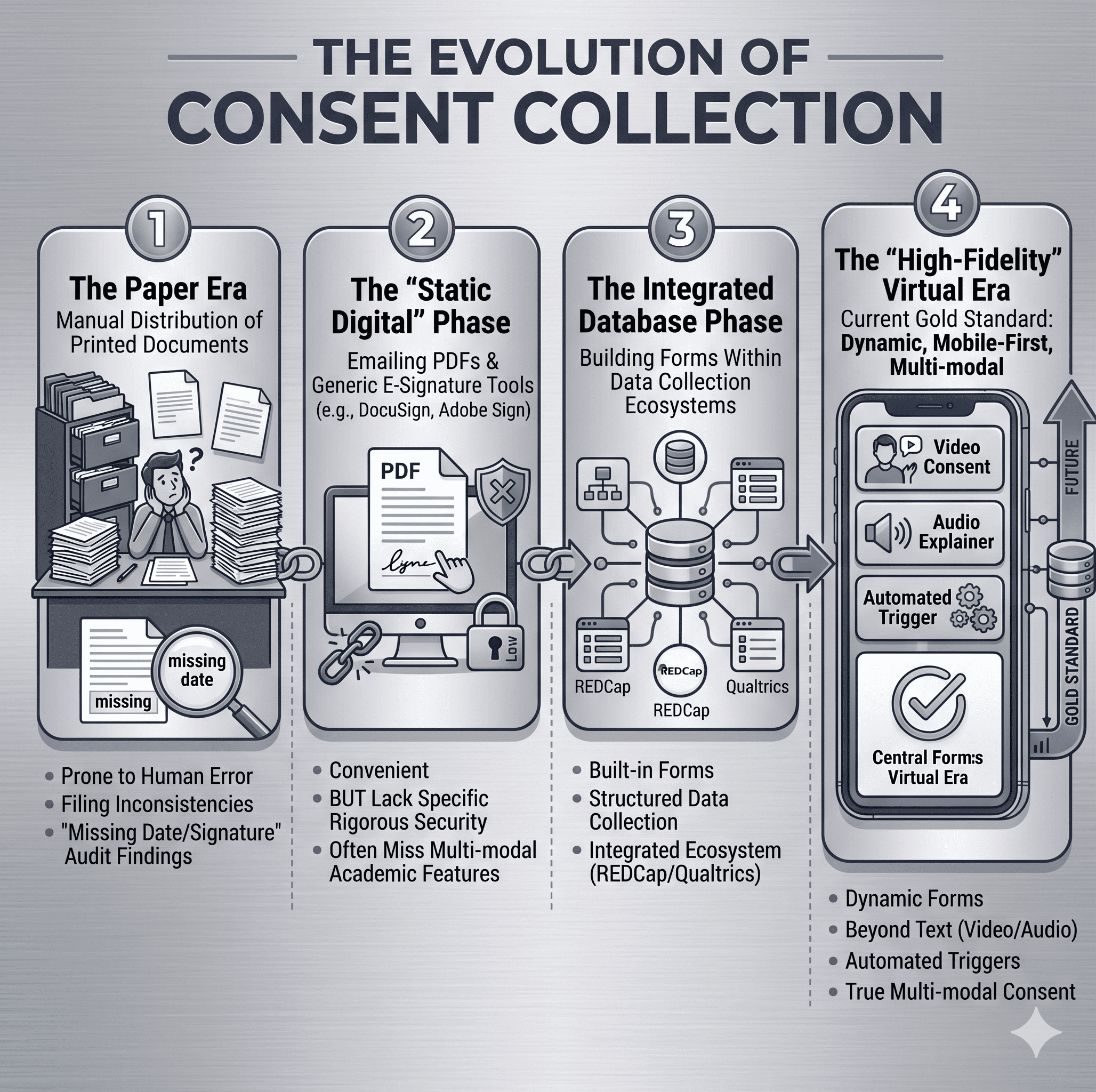 The "High-Fidelity" Virtual Era: The current gold standard, where consent is dynamic, mobile-first, and multi-modal, moving beyond text to include video, audio, and automated triggers.